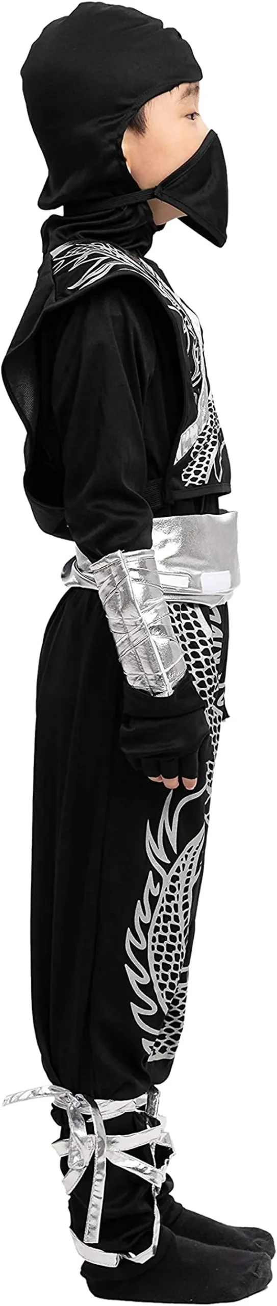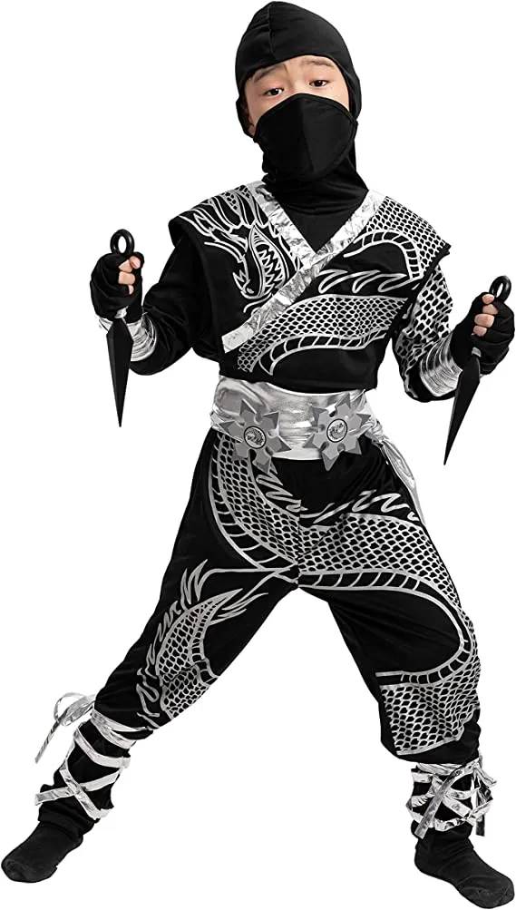 This dragon ninja costume with a jumpsuit with an attached hood, face mask, belt, ninja gloves, and 4 ninja accessories will be staying out of sight on Halloween night. Allow your child to dress up as a ninja for Halloween and take to the streets as a sneaky character! When he dresses in a mysterious boysβ ninja costume that is sure to impress everyone in the neighborhood, heβll be ready for any crime fighting that comes his way! Gear up, little guy! Not much is known about the origins of the Ninjas aside from that they were usually recruited from humble beginnings. Ninjas have also been known to disguise themselves and enter enemy camps in order to collect information or carry out assassinations