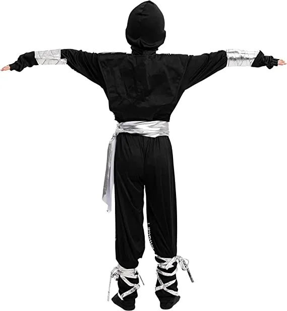 β’ Silver Ninja Halloween Costume Includes Jumpsuit w/ Attached Hood, Face Mask, Belt, NInja Gloves, 4 ninja accessories.