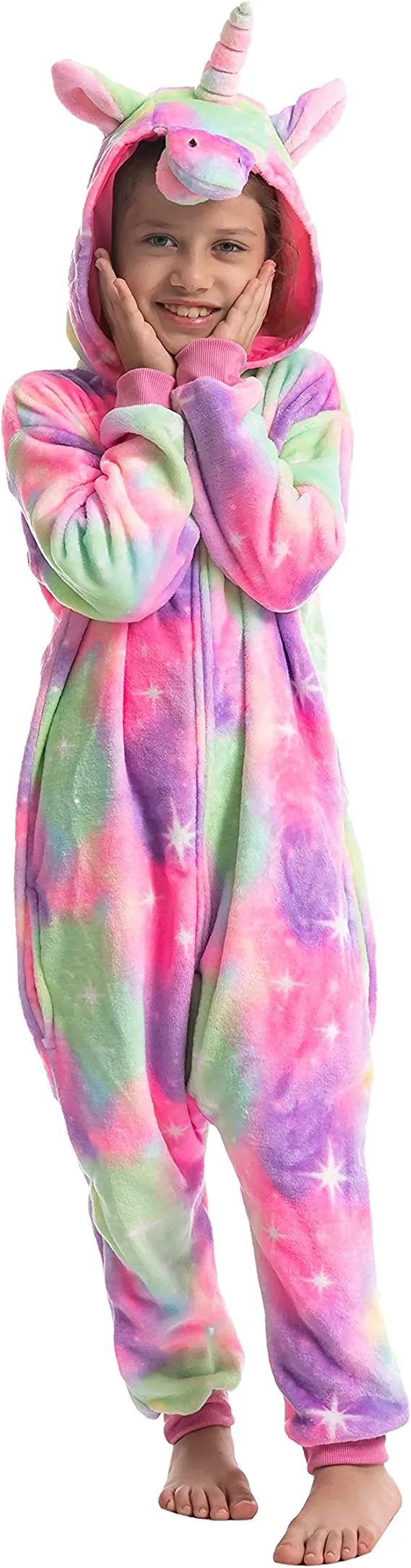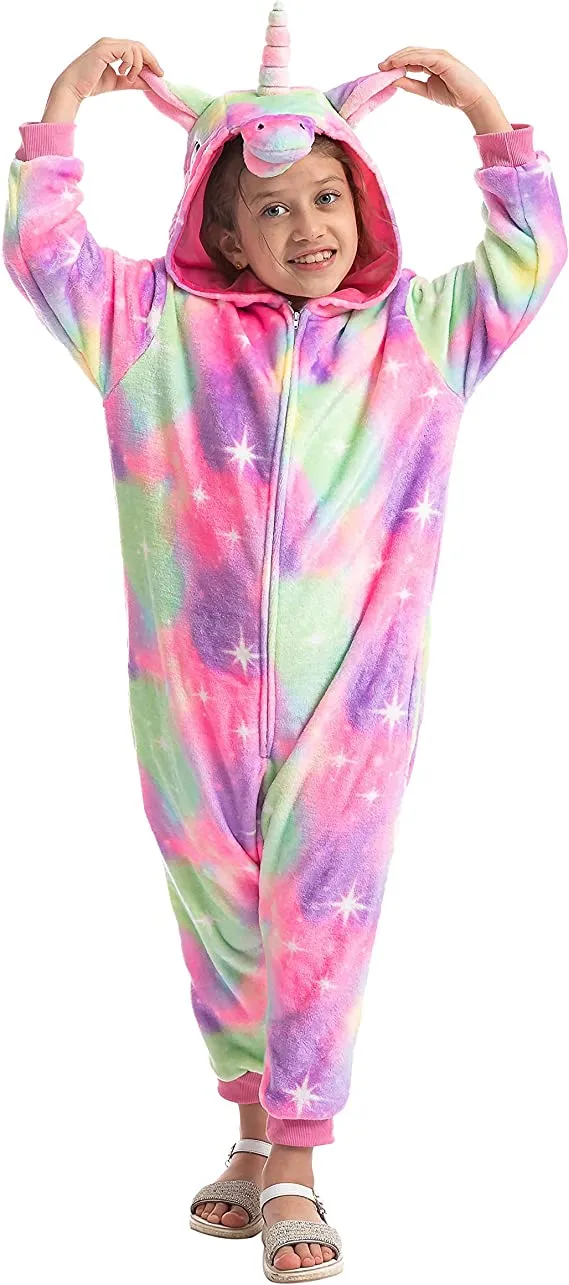 β’ Kids Unicorn Onesie comes with One Piece Plush Cosplay Animal Costume Onesie. Child Size. Made with High-Quality Plush Fleece Materials.