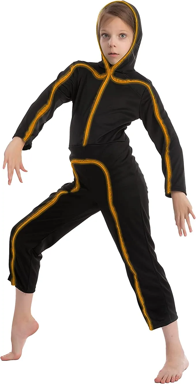 - Child light up stick figure costume comes with wired neon lights, making your Halloween party glow in the dark. Battery Powered – requires (2) AA batteries for use (not included).
