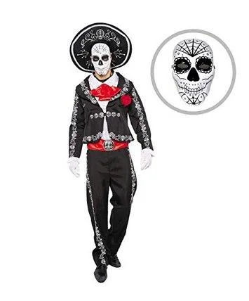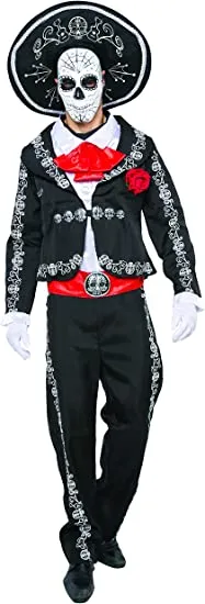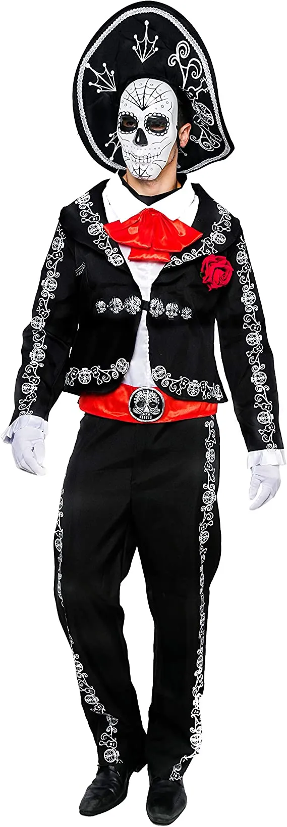 β’ Our dia de los muertos costumes for Men, includes Mariachi Spanish Sugar Skull Print Jacket w/ attached Cuffs and Red Rose, Mock Shirt w/ attached Tie, Mask, Red Belt Sash, Sombrero Hat, 1 Pair of Black Pants w/ White Sugar Skull Embroidery Trim Design along the Sides, 1 Pair of Gloves