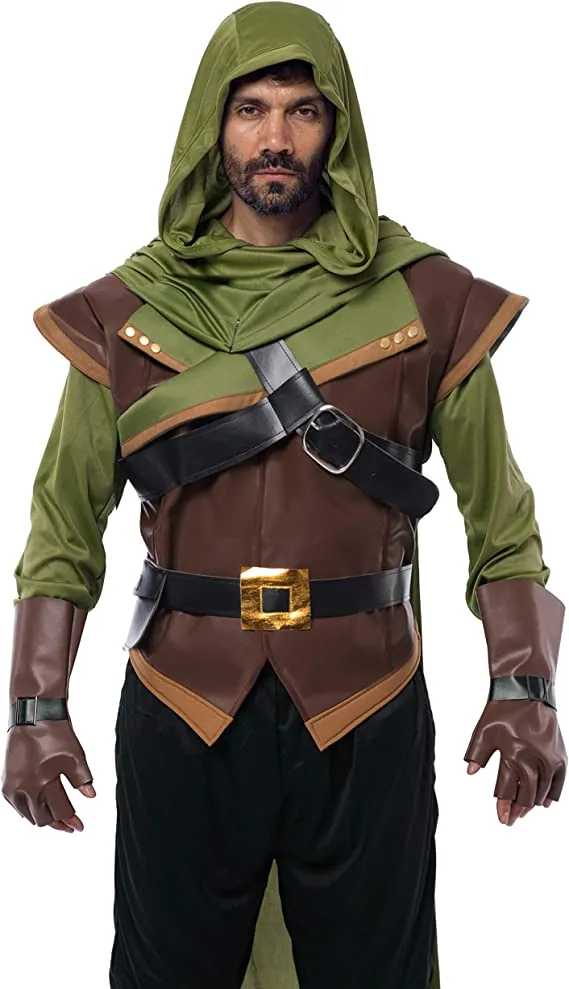β’ Mens Robin Hood Costume includes Menβs Leather Tunic with Long-sleeve shirt, Hood, Vest, and Cape, 2 Gauntlet Gloves, Belt with Pouch, a Pair Pants with Boot Covers! (Arrows and Bow not included)