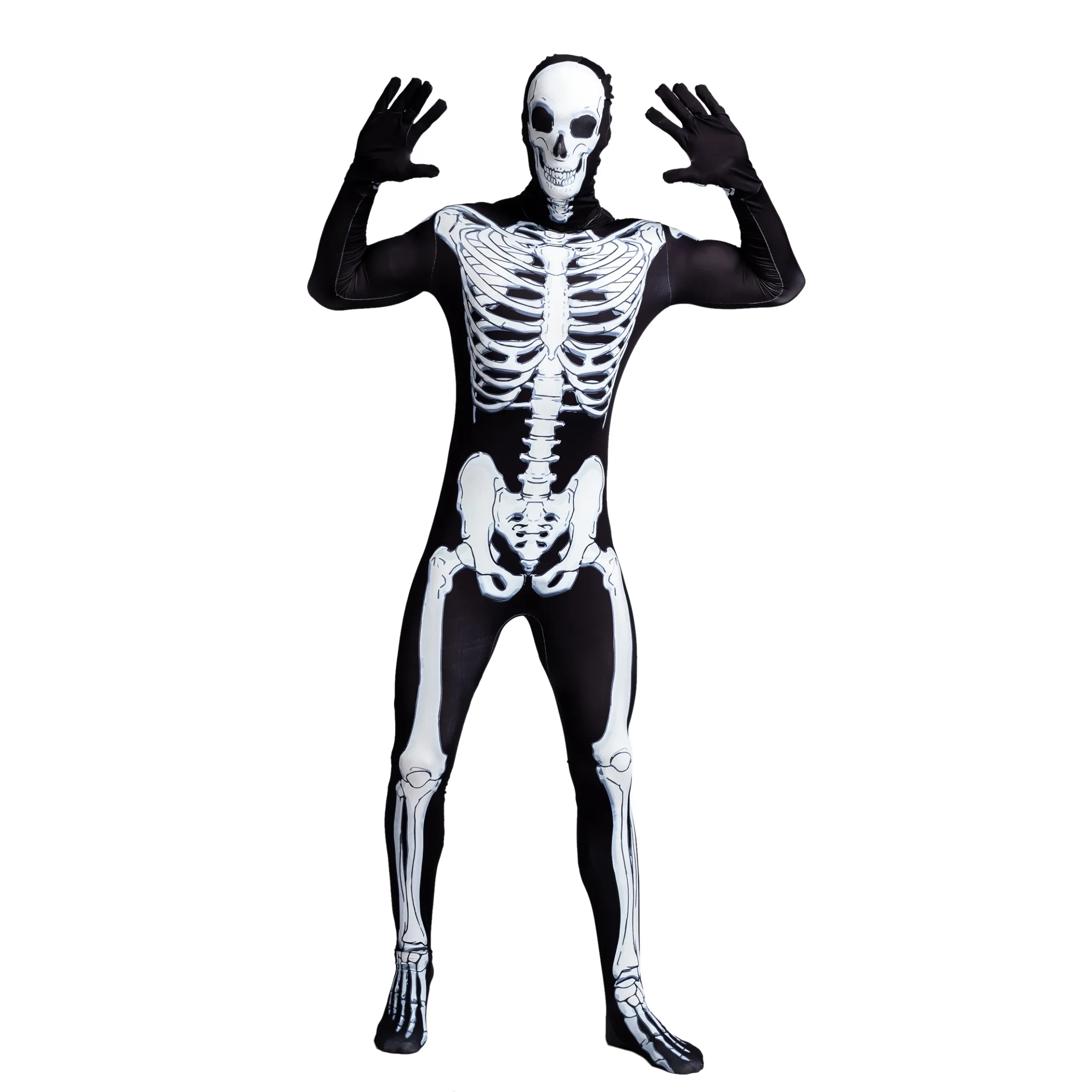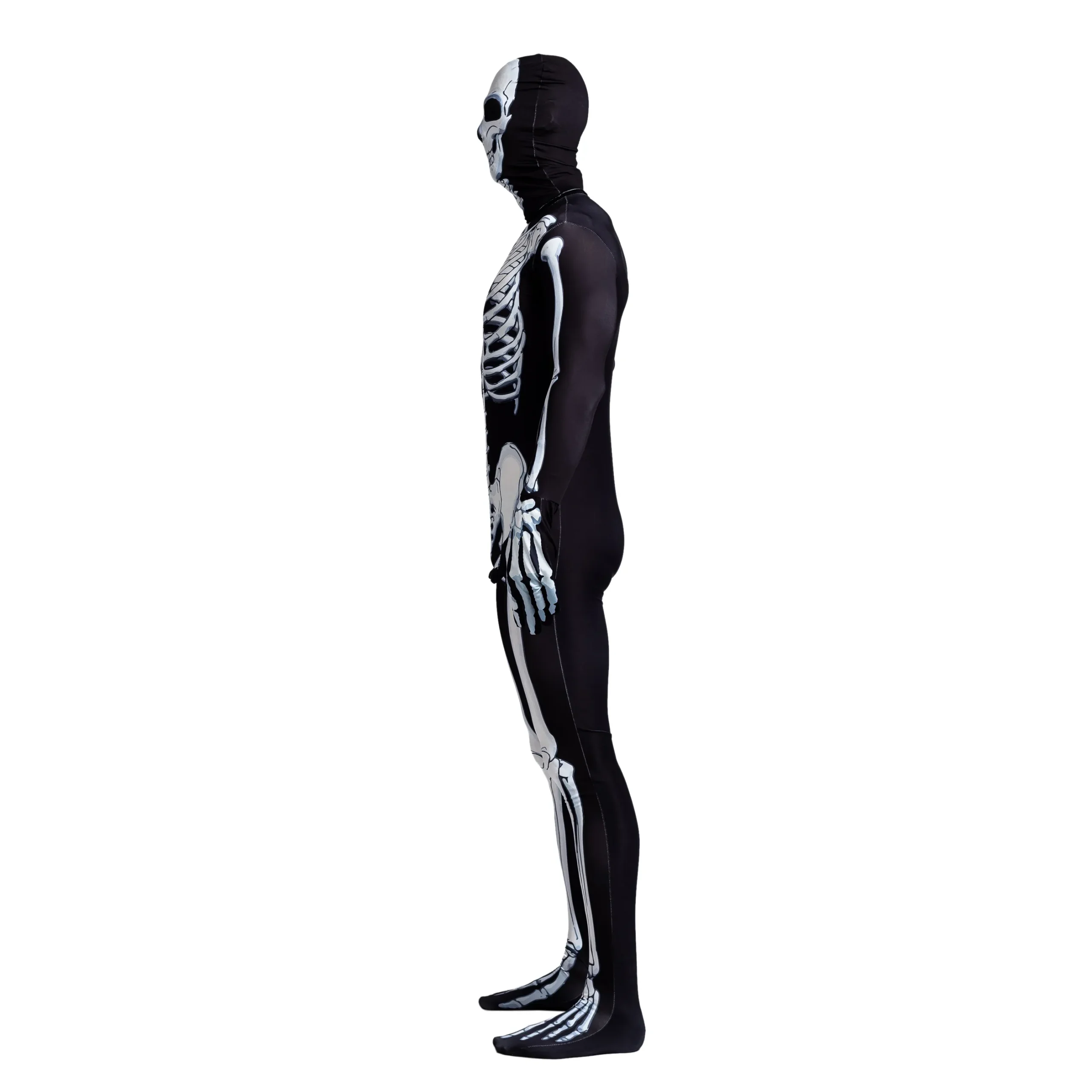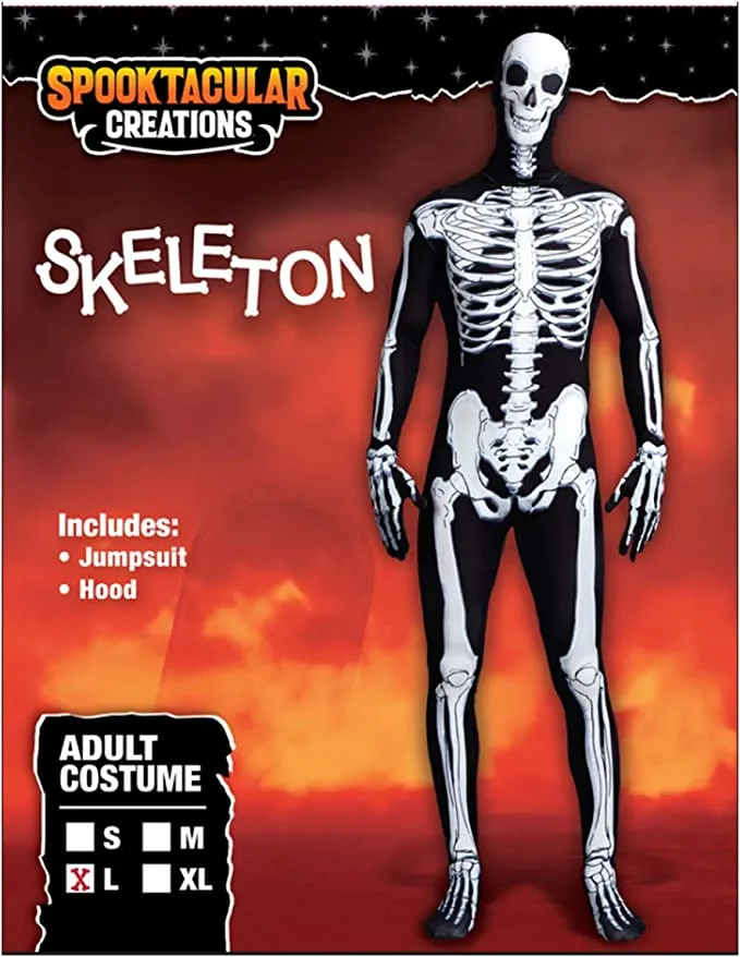β’ Second Skin Skeleton Costume Includes Skeleton Jumpsuit with Skull Hood.