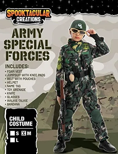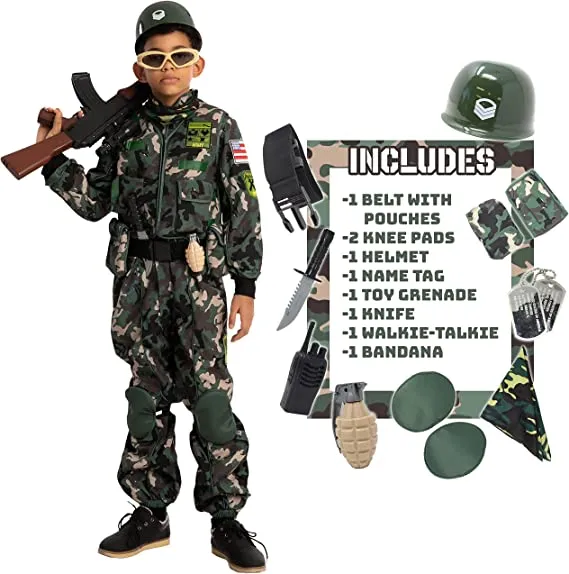 - Our Boys Military Soldier Army Costume Set includes a Foam Vest, Jumpsuit w/ Knee Pad, Belt w/ Pouches, Helmet, Name Tag, Glasses, Walkie-Talkie, other two toy accessories and a Bandanna.