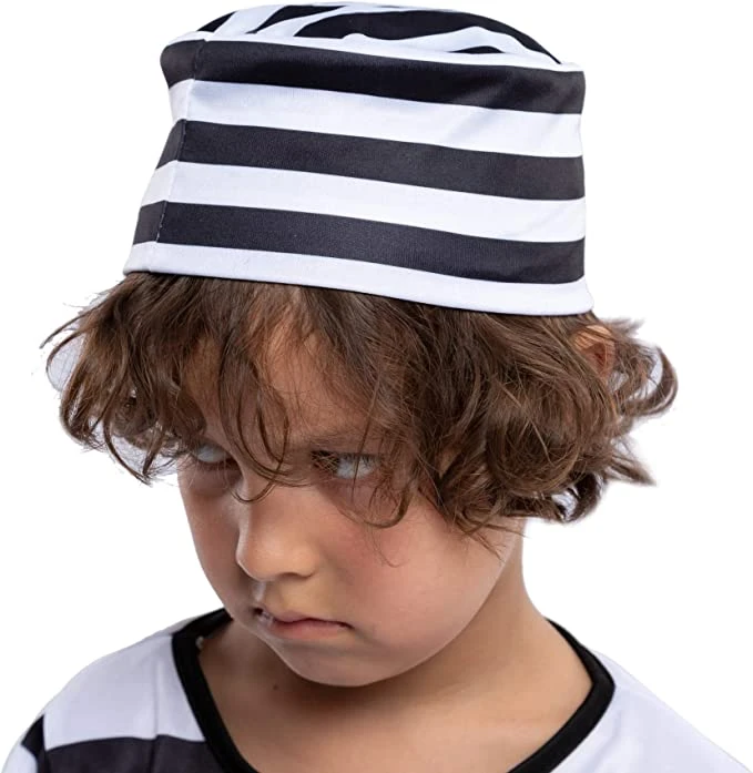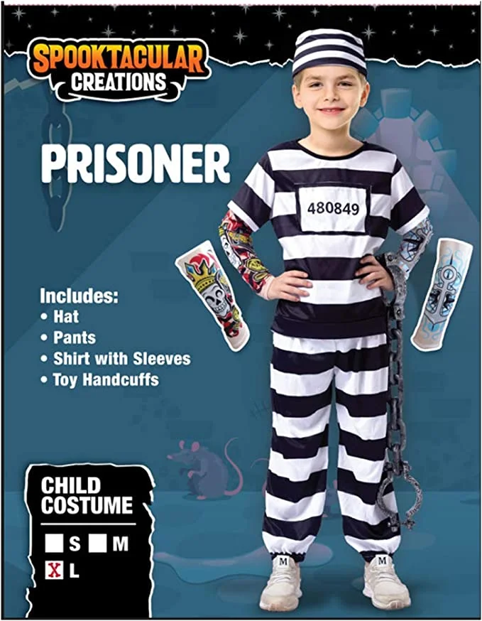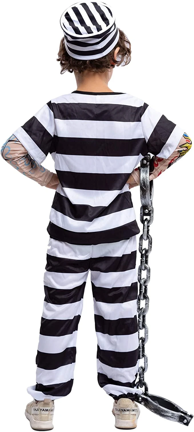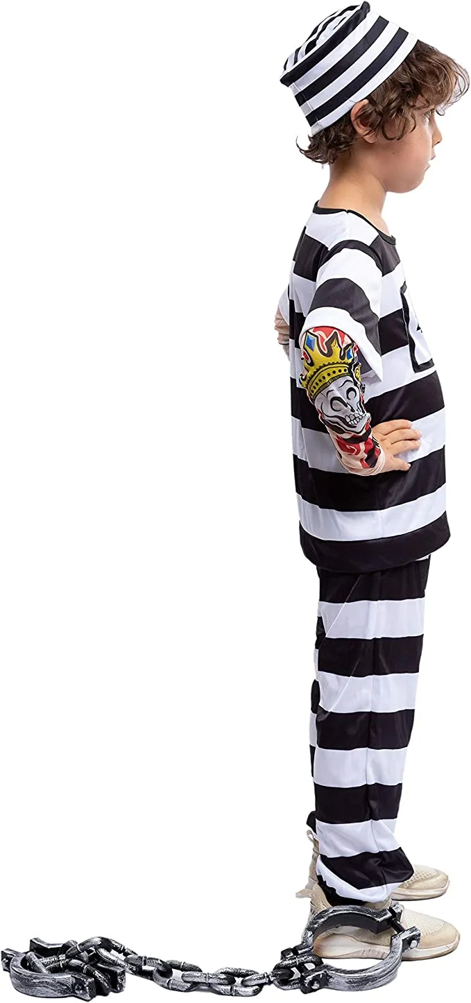 • Prisoner Halloween Costume Includes Jailbird Hat, Balck, and White Striped Shirt with Attached Tattoo Sleeves, Prison Pants, and Toy Handcuffs for Kids.