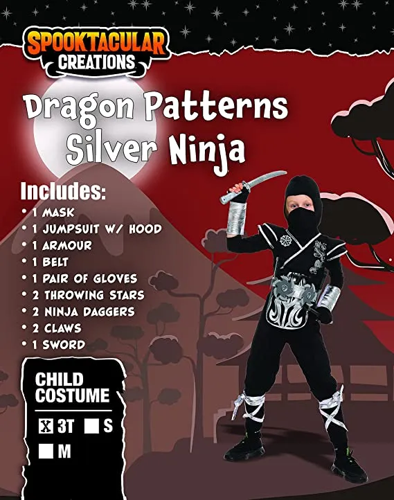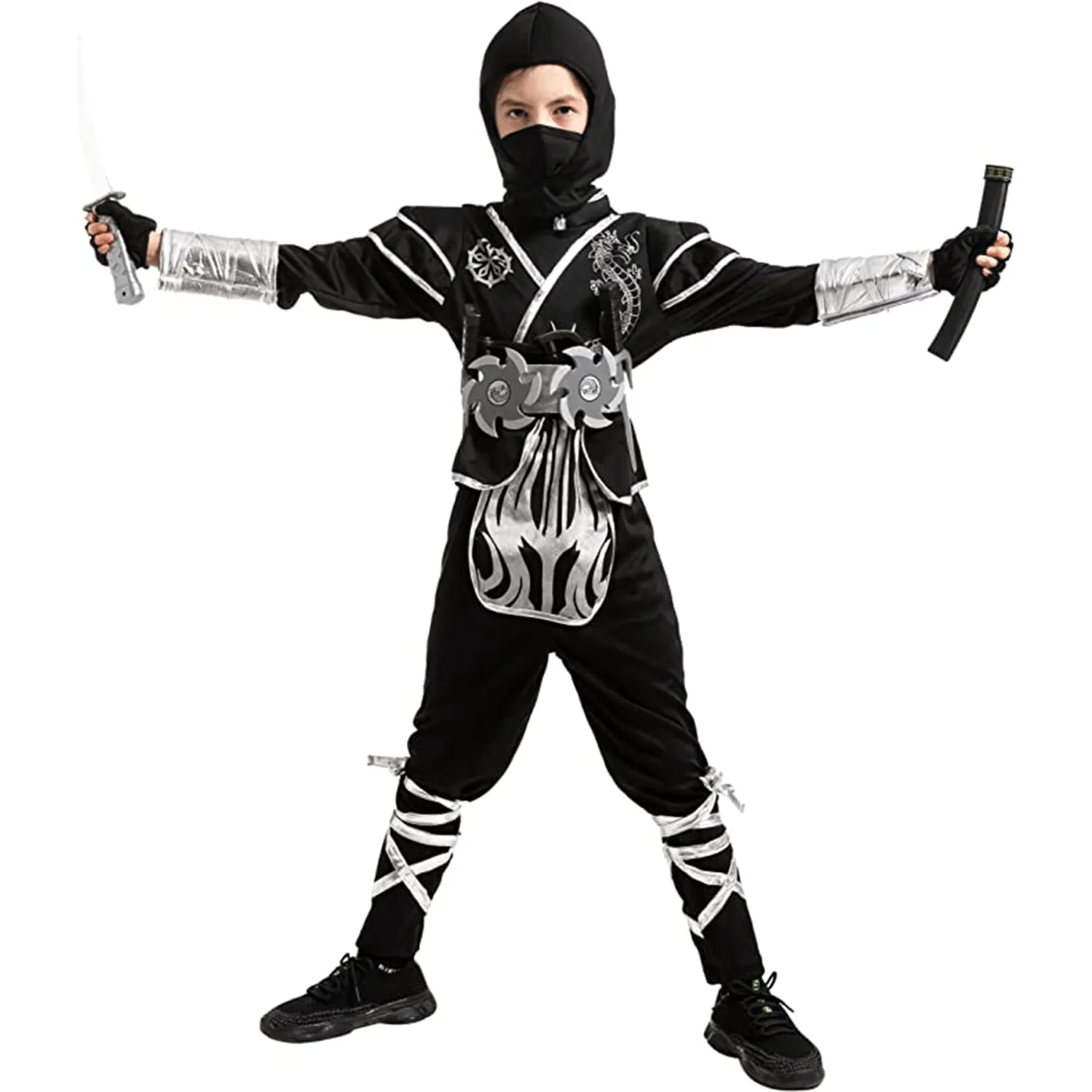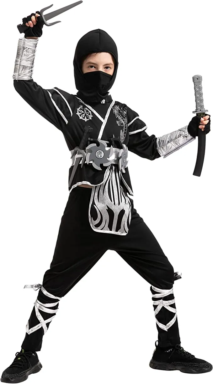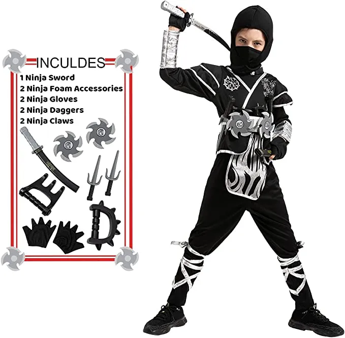 - Ninja Costume for Boys All in One Set. Includes mask, hood, jumpsuit, armor, belt, one pair of gloves, two ninja daggers, two claws, one sword and other foam accessories.