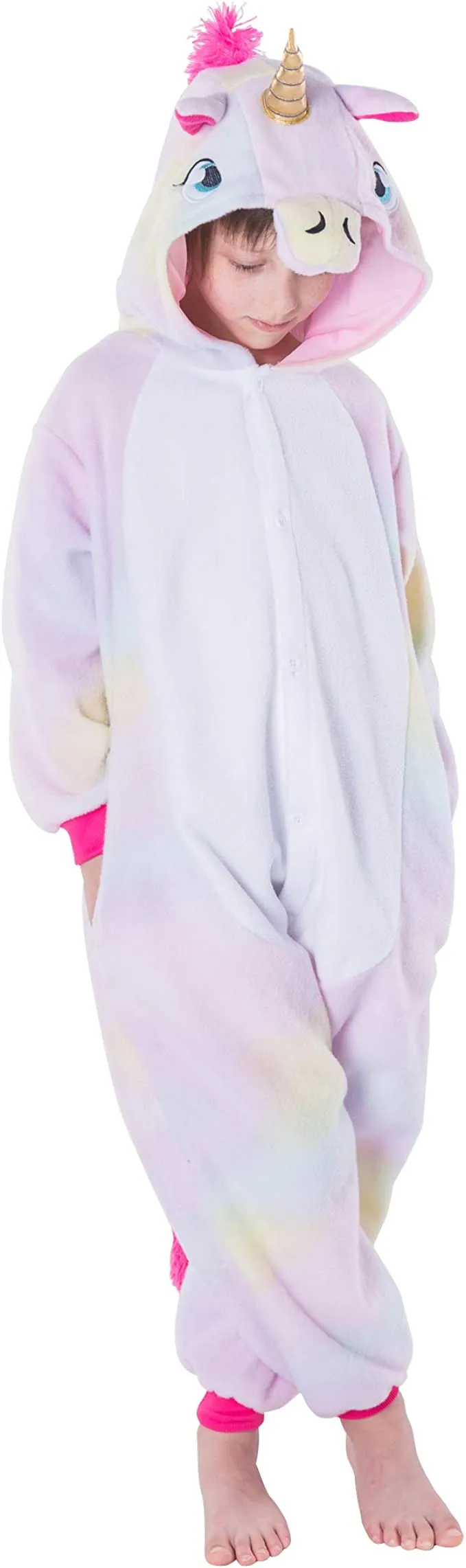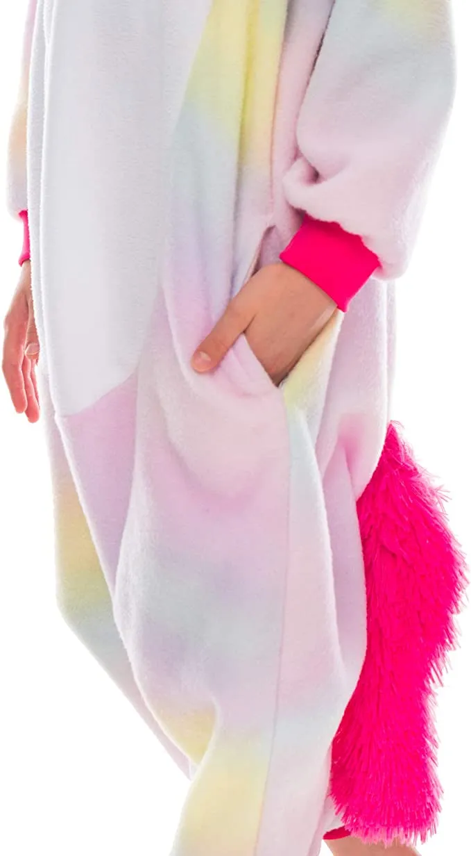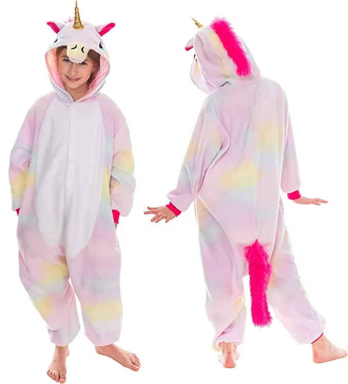 - Deluxe Version of Unicorn Pajamas One Piece Plush Cosplay Animal Costume Onesie. Child Size. Made with High-Quality Plush Fleece Materials.