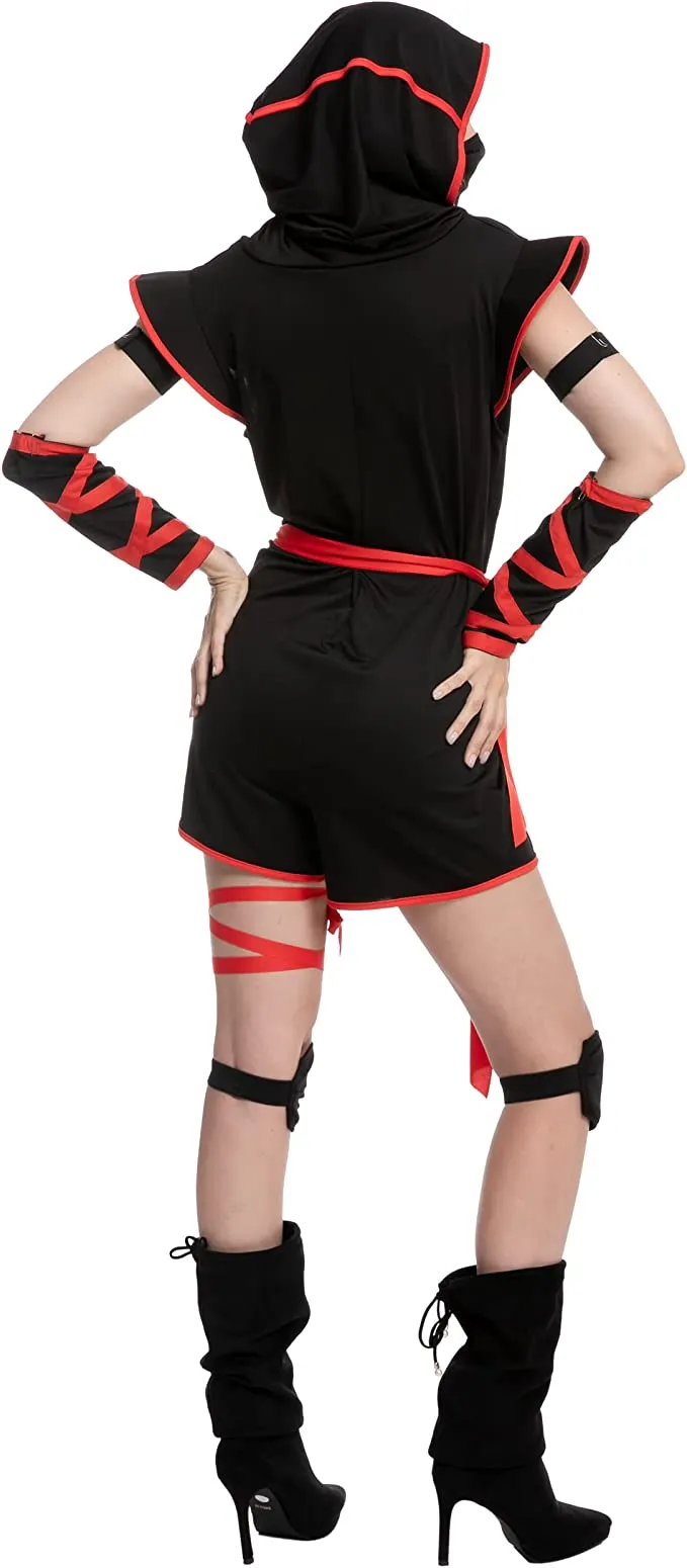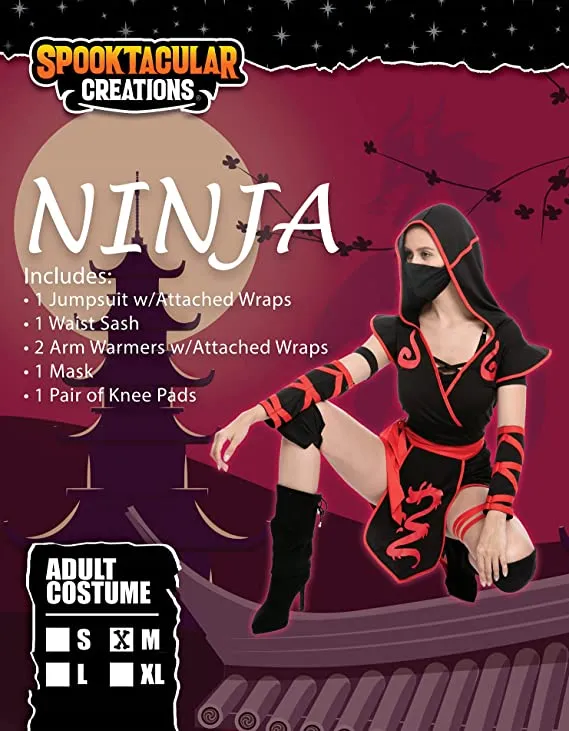 β’ Women Ninja Halloween Costume for adult women includes a V neck and sleeveless style with a dragon print designed costume, a Ninja Mask, Waist Sash, hood, arm warmers, knee pads, boots, and more.