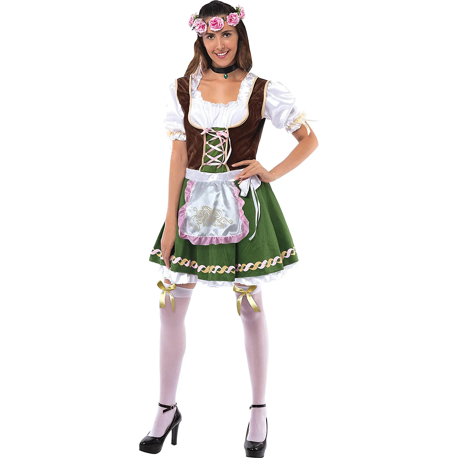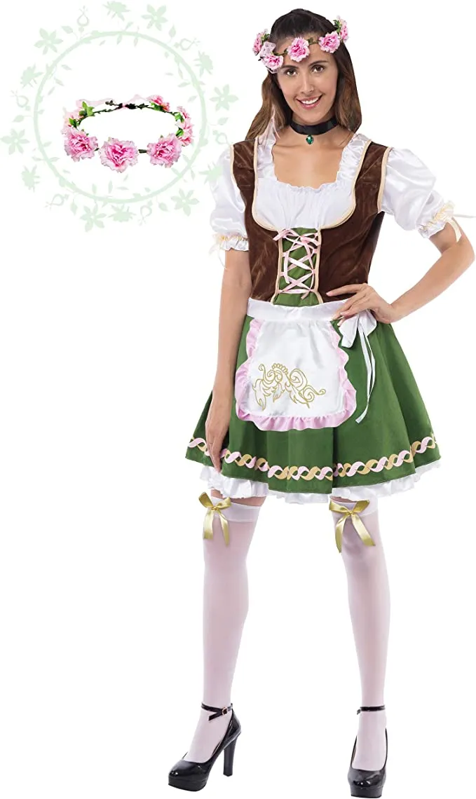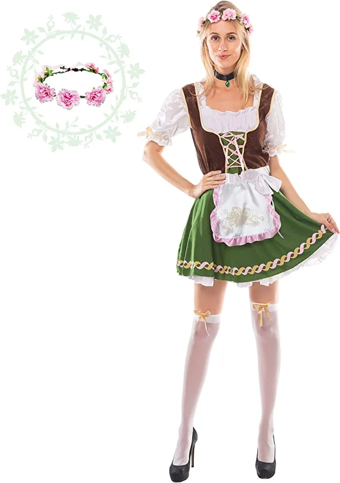 - Bavarian Oktoberfest Fraulein Lederhosen Costume for Women includes vintage dirndl dress with petticoat and apron, rose headband, knee socks with bows, and one choker.