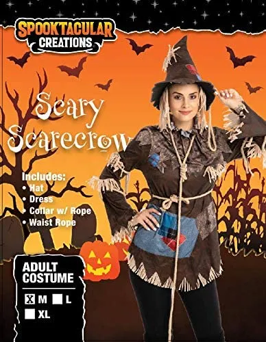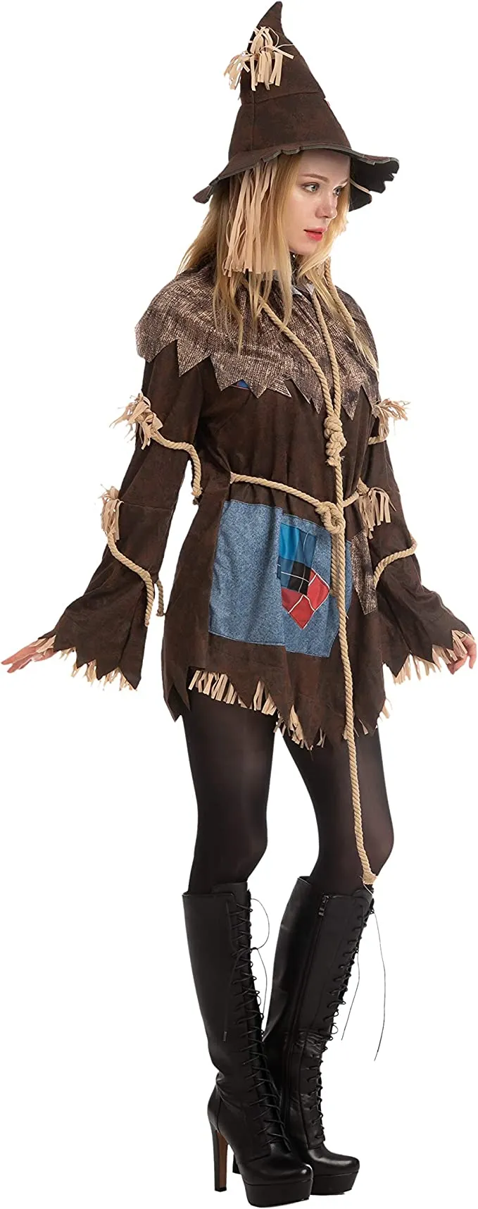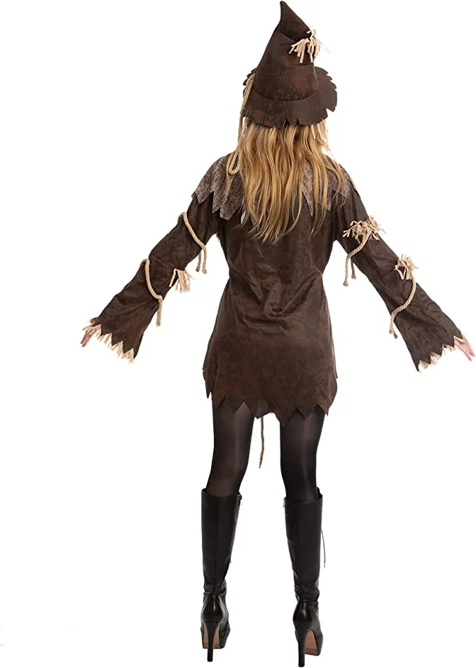 β’ Womens Scarecrow Halloween Costume Includes a Hat, Dress, Collar with rope, and Waist rope.